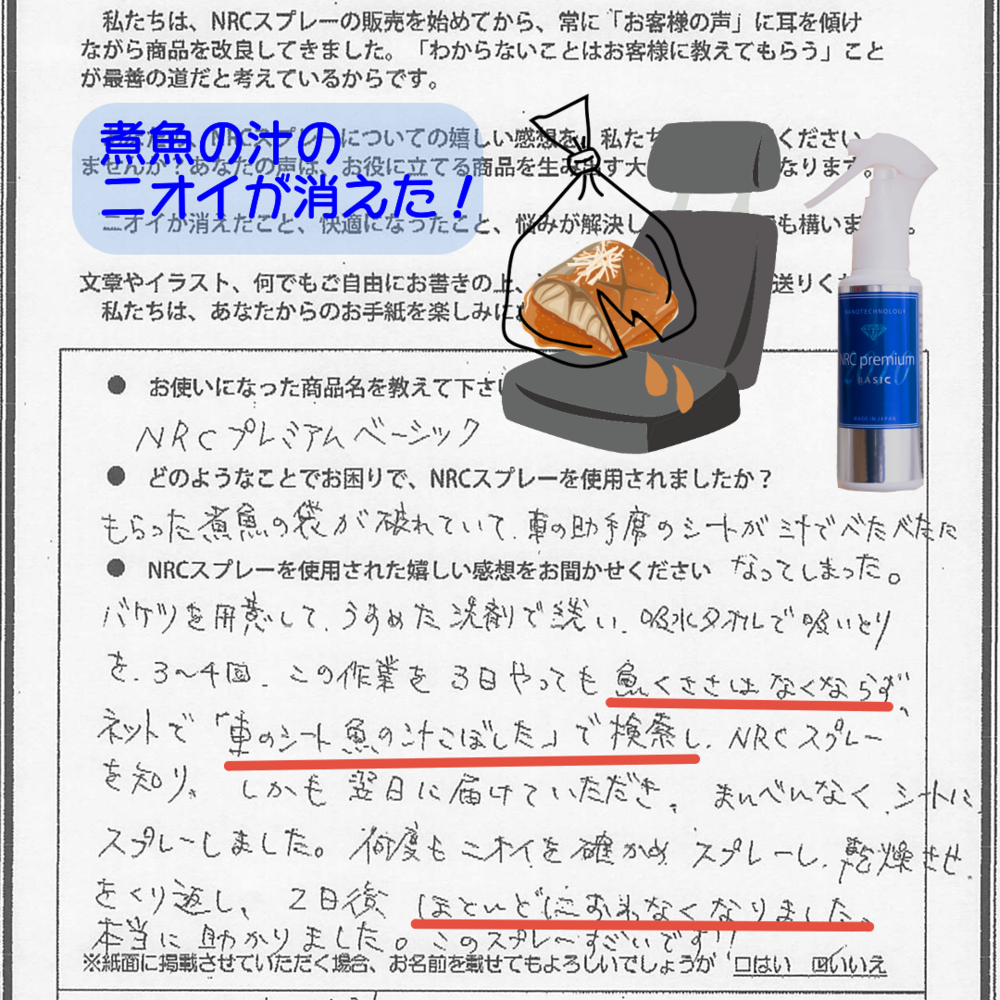 魚臭さが取れず「車のシート 魚の汁こぼした」というキーワードで検索し、NRCを見つけてくださったそう。