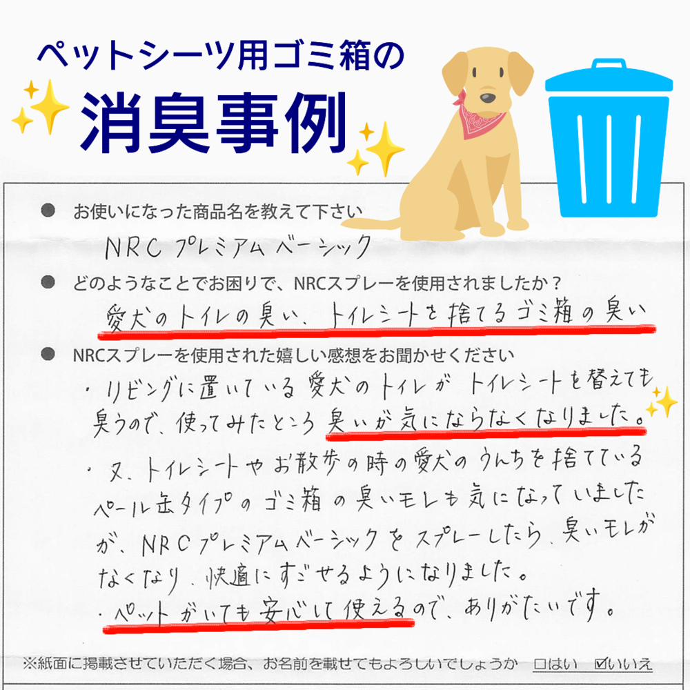 ペットと暮らすご家庭での“臭いのお悩み”に、NRCスプレーが少しでもお役に立てていることを私たちも大変嬉しく思います。