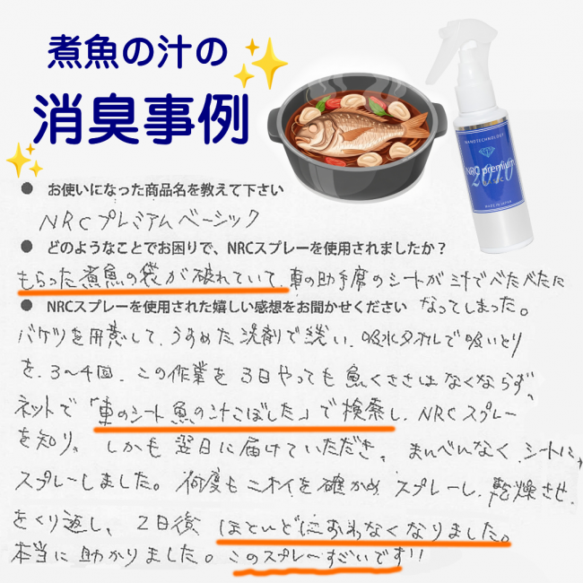 今回は実際に「魚の汁をこぼしてしまった」際にNRCプレミアム ベーシックをお使いいただいたお客様の声とともに、