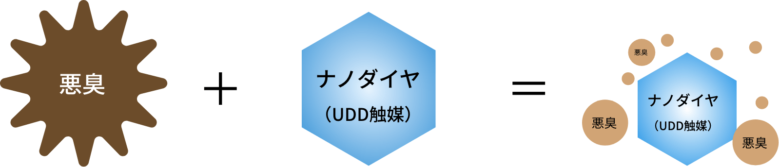 ニオイの原因物質を、ナノダイヤ(UDD触媒)の働きで分解して消臭する方法。